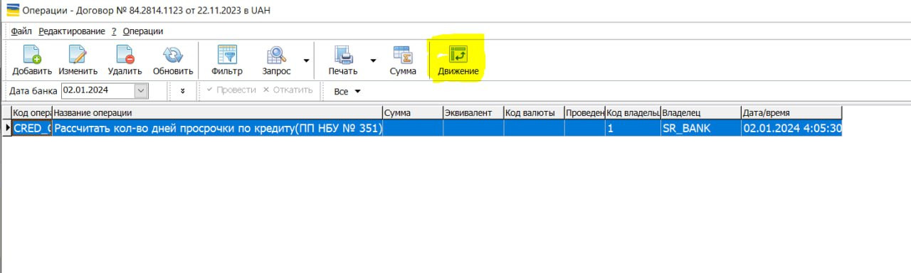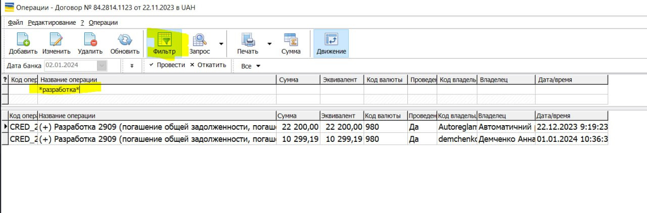 Заходимо у Sr -14 Кредити - депозити - 14.1 - Робота з кредитними договорами Знайти клієнта по ІПН - вибрати кредит і натиснути F8 (відкриється виписка, але не повністю, буде як на скріншоті №4 і потрібно натиснути на Рух - За всі дати). Далі там з'явиться виписка за сумами, але платежі які нам треба дивимося швидко через ФІЛЬТР "розробка" (дивись скрін №5 - у кл два платежі за кредит було всього)